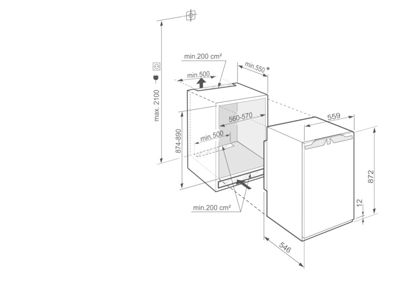 Paroi supérieure et parois latérales chauffées, combinaison possible avec d'autres réfrigérateurs, congélateurs et / ou armoires à vin