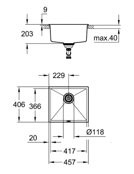 découpe (à encastrer par dessous) : 417 x 366 mm