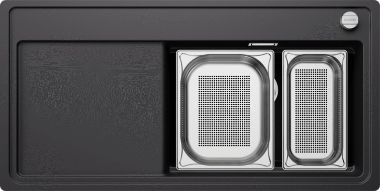 Planche à découper en frêne-composite, plat vapeurGN 1/3 perforé, plat vapeur GN ½ perforé, système d’écoulement compact à encombrement réduit, bonde-corbeille 3 ½'' InFino® avec bouton tournant de commande