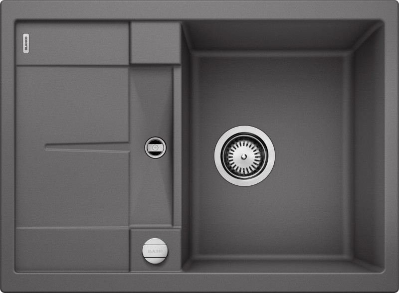 Plaatsbesparend afloopgarnituur, korfventiel 3 1⁄2" met draaiknopbediening voor de automatische versieBLANCO METRA 45 SÉvier composite de granit de SILGRANIT® PuraDur®