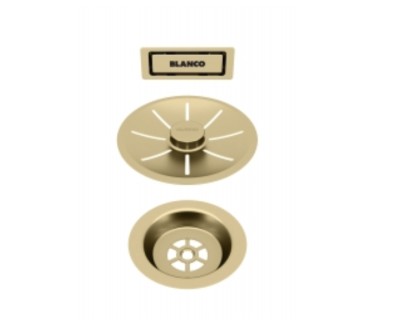 Système d'écoulement et trop- plein pour la mise à jour deséviers et des cuves dans un look harmonieux avec des mitigeurs, du distributeur de détergent et de la tirette en satin gold.