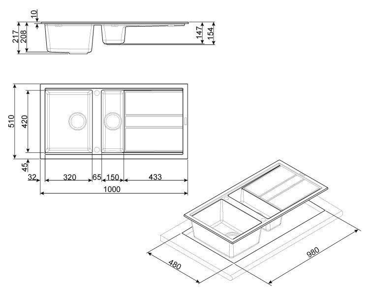 2 ouvertures perforées pour grue et système de vidage < Accessoires fournis: Crepine, Siphon pour le raccordement du lave-vaisselle, Clips de fixation