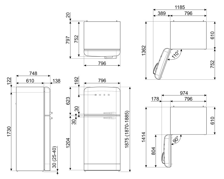 187cm - 400L+124L - Charnières à gauche - Noir - NoFrost - Combiné frigo-congélateur pose libre / Smeg