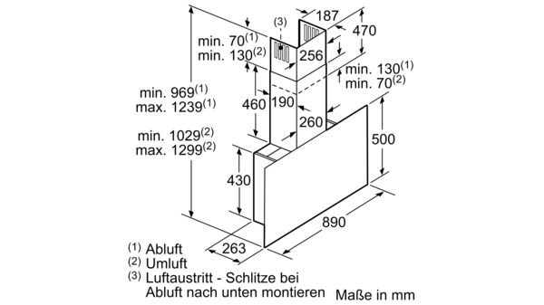 Dimensions appareil en évacuation d'air (HxLxP): 969-1239 x 890 x 263 mm
