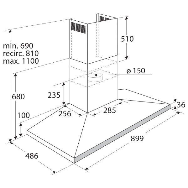 90 cm largeur | Système d'évacuation d'air OU de recyclage (filtre à charbon/filtre à plasma) | haut: de 700 m3/h