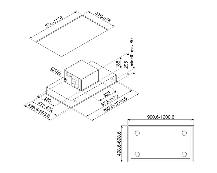 90 cm largeur | Système d'évacuation d'air OU de recyclage (filtre à charbon/filtre à plasma) | haut: de 700 m3/h