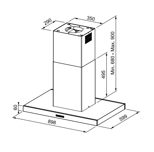 90 cm largeur | Système d'évacuation d'air OU de recyclage (filtre à charbon/filtre à plasma) | normal: de 400 à 700 m3/h