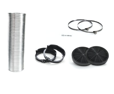 Comprend: 2 filtres à charbon actif, support de filtre à charbon actif, déflecteur, tuyau flexible ø 150 mm et 1500 mm de long, 2 colliers de serrage et matériel de montage