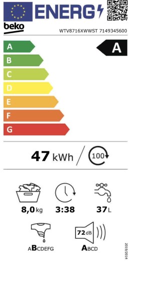 8KG - 1400 t/min - Classe A (très économe) - Moteur inverteur - Programme Court - Lave-Linge / Beko WTV 8716 XWWST