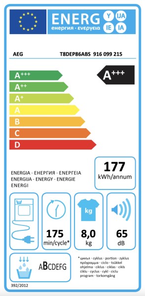 8KG - A+++ très économe - Pompe à chaleur - ProSense - Tambour alternant - ProSense (économie d'eau et d'énergie) - SensiDry (séchage à basse température) - AbsoluteCare (soin supplémentaire pour tissus délicats) - Sèche-Linge / AEG T 8DEP86 ABS