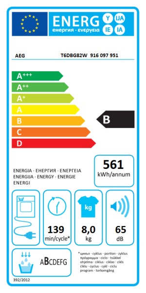 8KG -B-class - Tambour en inox - Tambour alternant - ProSense (économe d'eau et d'énergie) - sèche-linge condensation / AEG T 6DBG82 W