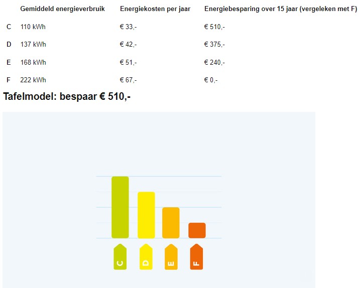 Même avec un réfrigérateur, vous serez plus économique avec un modèle C au bout d'un certain temps. Avec un réfrigérateur, vous économisez au total 510 euros en frais d'énergie. Cela équivaut aux émissions de 4,5 années de douche. L'étiquette A est actuellement la plus élevée pour les réfrigérateurs.