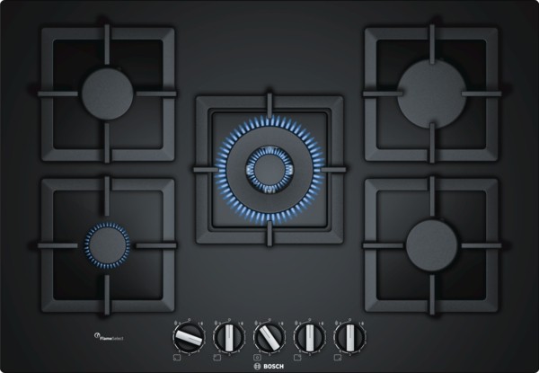 75cm - Piano a filo - Verre haute résistance - 5 zones de cuisson - Noir - Brûleur wok - Plaque de cuisson au gaz / Bosch