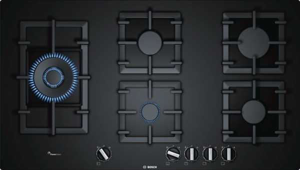 92cm - Piano a filo - verre haute résistance - 5 zones de cuisson - Noir - Brûleur wok - Plaque de cuisson au gaz / Bosch