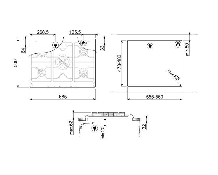 69cm - Sans encadrement - 5 zones de cuisson - Inox - Brûleur wok - Plaque de cuisson / Smeg