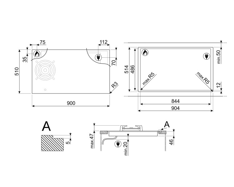 90cm - sans encadrement - 5 zones de cuisson - 2 zones flex + 1 brûleur wok au gaz! - Plaque de cuisson induction + gaz / Smeg