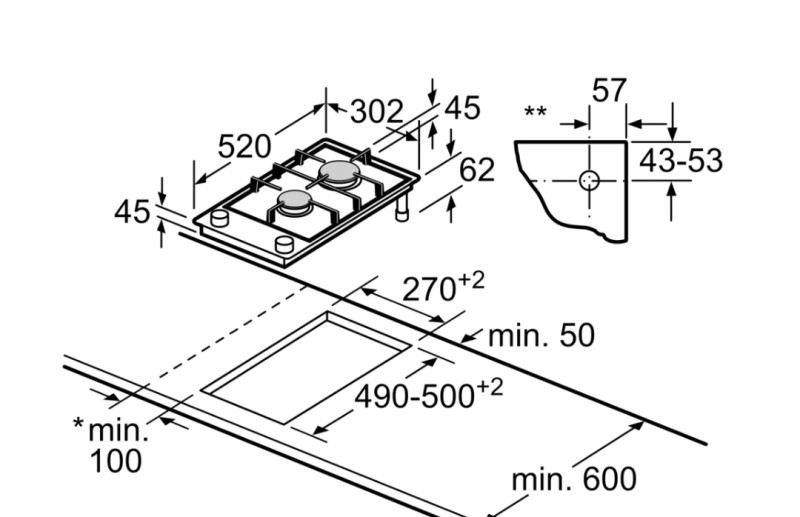 Taille de la niche d'encastrement : 45 x 270 x 490-500 mm