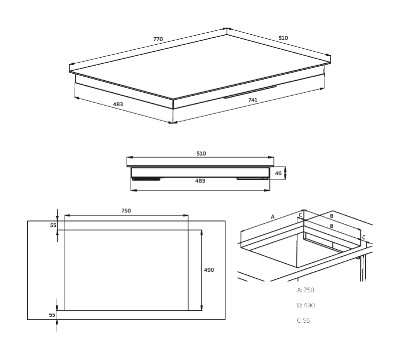 Zanussi 78cm - sans encadrement - 4 zones de cuisson - TripleZone (zone de cuisson très grand) - Plaque de cuisson ZHRN 893 K