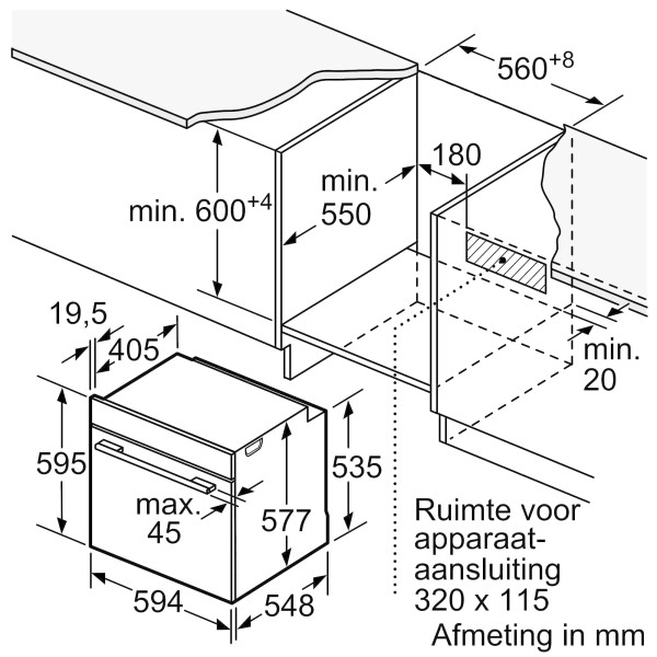 Inbouwafmetingen (HxBxD): 585-595 x 560-568 x 550 mm