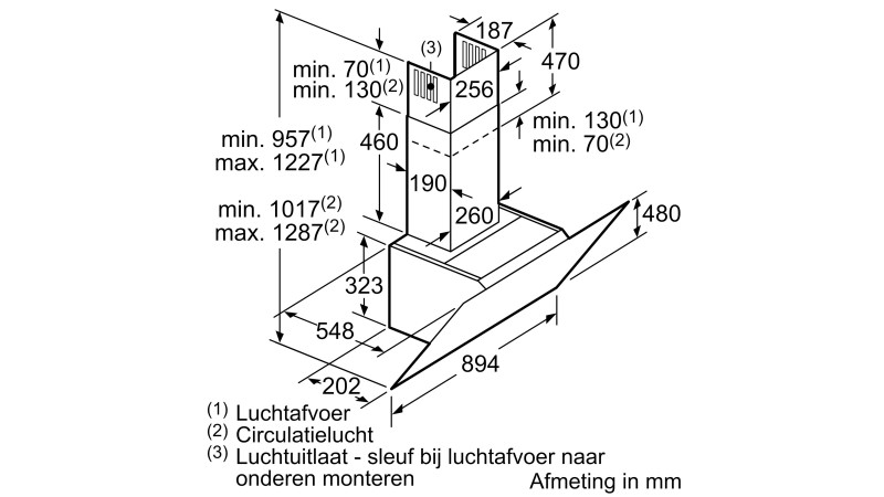 Toestelafmetingen bij luchtafvoer (HxBxD): 957-1227 x 894 x 548 mm
