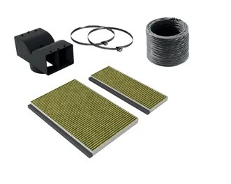 Bestaande uit 2 Clean Air Plus actief koolstoffilters, deflector, flexibele slang, 2 slangklemmen en bevestigingsmateriaal