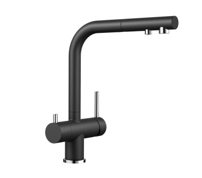 Afzonderlijke bedieningshendels: hendel rechts voor koud en warm water en draaihendel links voor gefilterd water