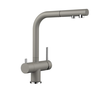 Afzonderlijke bedieningshendels: hendel rechts voor koud en warm water en draaihendel links voor gefilterd water