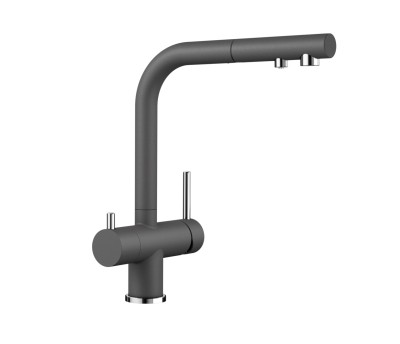 Afzonderlijke bedieningshendels: hendel rechts voor koud en warm water en draaihendel links voor gefilterd water