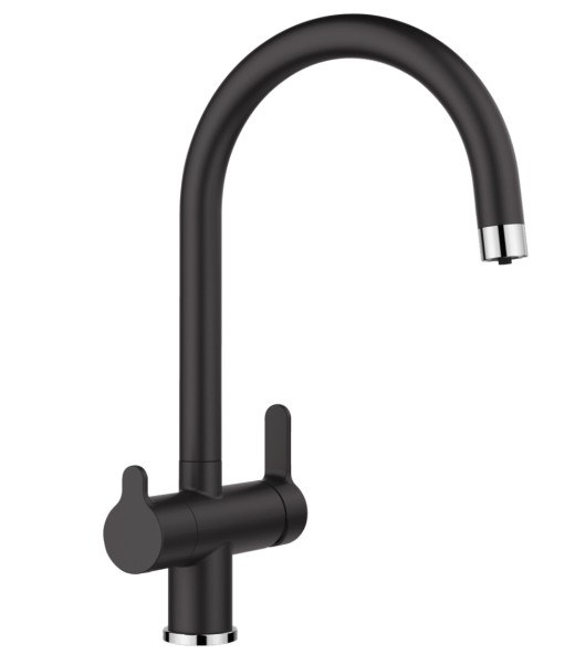 Comfortabele 3-in-1-mengkraan met bedieningshendel voor koud en warm water aan rechterzijde en bedieningshendel voor gefilterd water aan linkerzijdeErgonomisch gevormde bedieningselementen met duidelijke functies