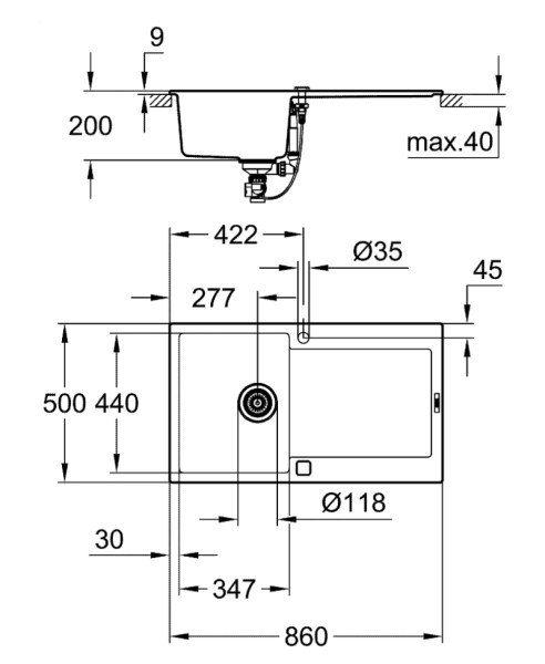 1 spoelbak: 347 x 440 x 200 mm