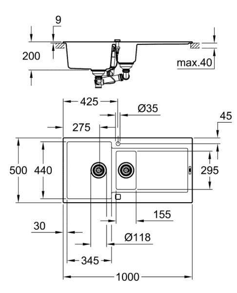 | Breedte (buitenmaat toestel) | 1.000 mm |