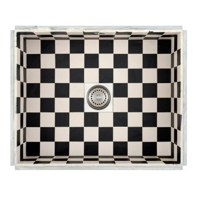Roestvrijstaal bekleed met tegeltjes, diepte 150mm, inclusief korfplugset en overloop. De bak altijd als mal gebruiken voor de uitsparing in het blad.