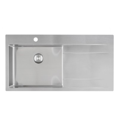 Bak links. Roestvrijstaal, diepte 185mm, inclusief korfplugset met design overloop en klemmen. Extra (kraan)gat: € 50,00.