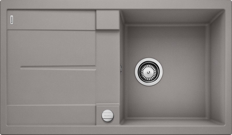 Plaatsbesparend afloopgarnituur, korfventiel 3 1⁄2", met draaiknopbediening voor de vlakbouw versieBLANCO METRA 5 SGranieten spoeltafel in SILGRANIT® PuraDur®