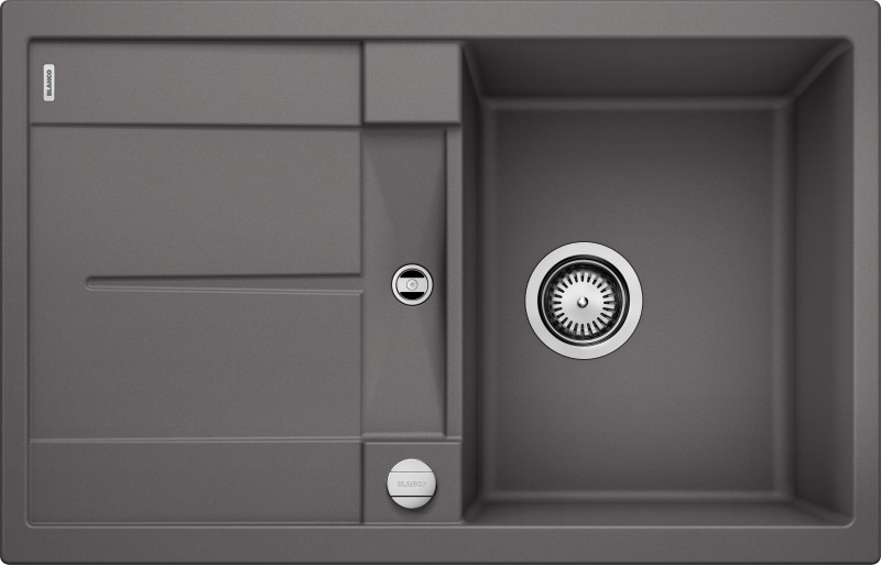 Plaatsbesparend afloopgarnituur, korfventiel 3 1⁄2", met draaiknopbediening voor de vlakbouw versieBLANCO METRA 45 SGranieten spoeltafel in SILGRANIT® PuraDur®