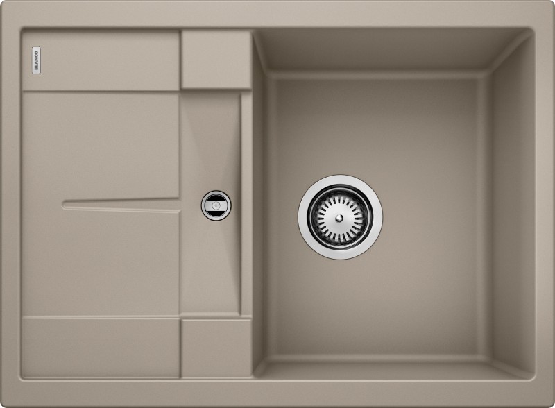 Plaatsbesparend afloopgarnituur, korfventiel 3 1⁄2" met draaiknopbediening voor de automatische versieBLANCO METRA 45 SGranieten spoeltafel in SILGRANIT® PuraDur®