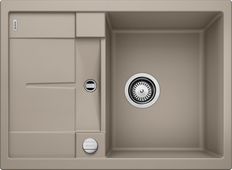 Plaatsbesparend afloopgarnituur, korfventiel 3 1⁄2" met draaiknopbediening voor de automatische versieBLANCO METRA 45 SGranieten spoeltafel in SILGRANIT® PuraDur®