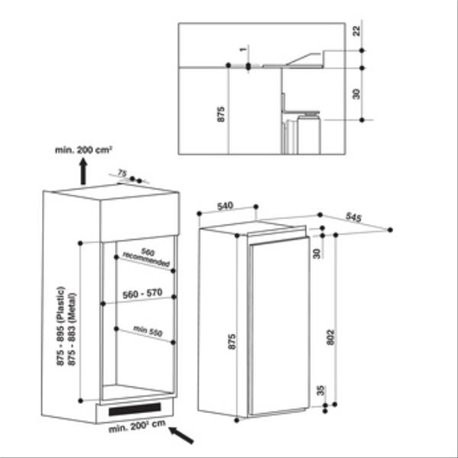 88cm - Glijbevestiging - met vriesvak - 104L+17L - Inbouw Koelkast / Whirlpool