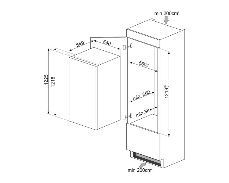 122cm - Glijbevestiging - met vriesvak - Inbouw Koelkast / Smeg