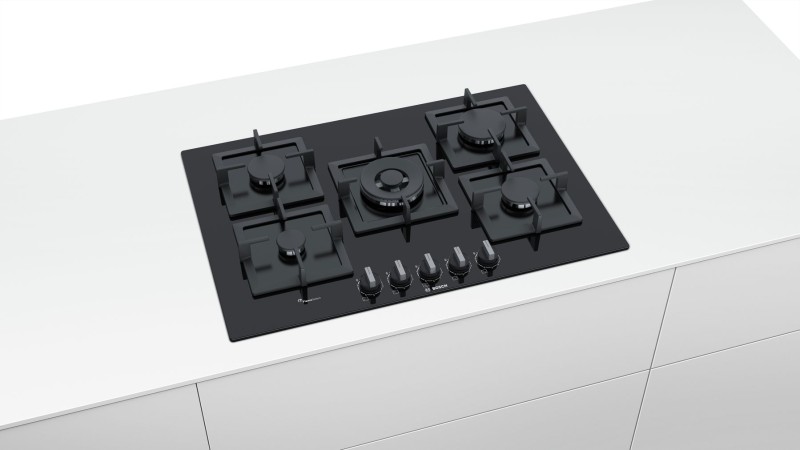 75cm - Gas op glas - Hardglas - 5 kookzones - Zwart - Wokbrander - Gaskookplaat / Bosch PPQ 7A6B 20