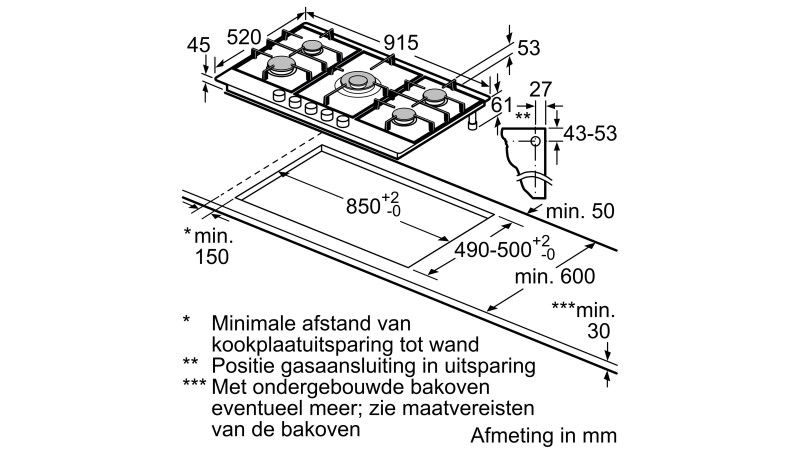 Inbouwafmetingen (HxBxD) : 45 x 850 x (490 502)