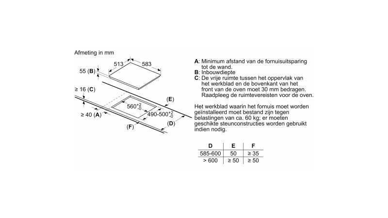 Inbouwafmetingen (HxBxD): 55 x 560 x 490 mm