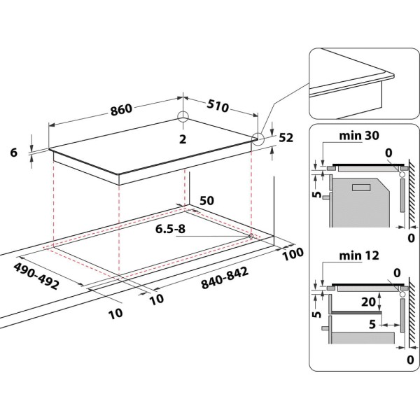 Uitsnijmaat werkblad (BxD): 840 x 490 mm
