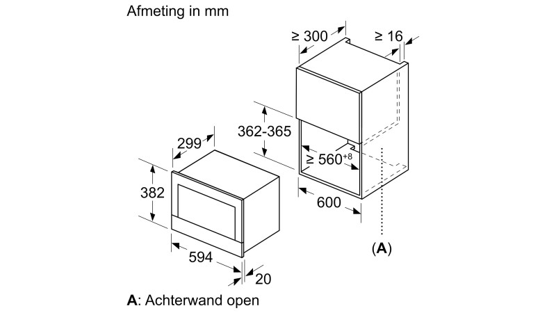 Inbouwafmetingen (HxBxD): 362-382 x 560-568 x 300 mm