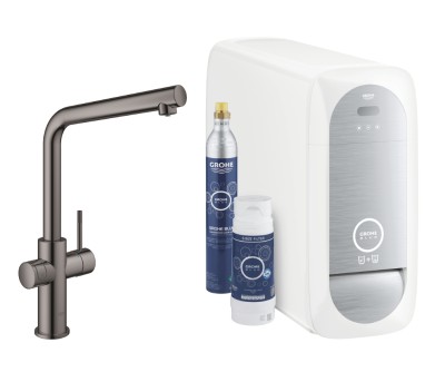 Je koopt nooit meer flessen water als je het gemak ervaart van een waterfiltersysteem waarmee je thuis met een druk op de knop puur, plat of bruisend water kunt krijgen direct uit je eigen keukenkraan. De GROHE Blue Home Duo starterkit is de complete manier om te genieten van puur, gekoeld drinkwater. Kies uit plat, medium of bruisend water. Met behulp van de GROHE Ondus-app** kan je nu je kraan activeren met je smartphone ***. Je kunt ook je verbruik controleren en zelfs instellen om filters en CO2-flessen opnieuw te bestellen wanneer deze aan vervanging toe zijn. Je kunt verder je telefoon gebruiken om je kraan op afstand in te stellen en je kunt jouw watergebruiksstatistieken koppelen aan je fit-apps. De set bevat een GROHE Blue- keukenkraan met één hendel in stijlvol Hard Graphite en een energiezuinige thuiskoeler met daarin de filter en de CO2-fles voor carbonisatie. De koeler past in ieder keukenkastje dat meer dan 30 cm breed is, waardoor deze zelfs voor compacte keukens ideaal is. Zowel het filter als de CO2-fles van 425 gram verwijderen en vervangen is een fluitje van een cent. Je Blue Home Duo- kraan bevat alle voordelen van een geweldig design en klassieke looks, die kenmerkend zijn voor alle GROHE keukenkranen. De eenvoudig te gebruiken hoge C-uitloop met 150° draaibeweging en slanke lichaam bevat gescheiden binnenwaterwegen voor gefilterd en niet-gefilterd water. Als je de hendel aanraakt, krijg je standaard water om af te wassen. Maar druk je op de verlichte LED- drukknop dan activeer je de filter voor gekoeld of bruisend water uit de kraan. Het LED-display geeft aan wanneer de cartridge moet worden vervangen. Deze monobloc keuken mengkraan is vervaardigd in GROHE's karakteristieke vloeiende lijnen en bevat een krasbestendige GROHE StarLight afwerking en is voorzien van het duurzame GROHE SilkMove interne mechanisme voor een soepele bediening. En omdat er geen externe leidingen nodig zijn en alles in de set klaar is voor gebruik, duurt het maximaal 30 minuten om te installeren. GROHE Blue Home – de slimme nieuwe manier om te genieten van zuiver gefilterd water direct uit je kraan. * Met Bluetooth® 4.0 en WIFI-interface voor draadloze datacommunicatie (het Bluetooth®-woordmerk en -logo's zijn gedeponeerde handelsmerken van Bluetooth SIG, Inc. en elk gebruik van deze merken door Grohe AG gebeurt onder licentie. Andere handelsmerken en handelsnamen zijn die van hun respectieve eigenaars.) ** Gratis beschikbaar via iTunes-app of Google Play Store. *** Systeemvereisten: Apple iPhone met iOS 9.0 of hoger; Android-smartphone met Android 4.3 of hoger (Apple, het Apple-logo, iPod, iPod Touch, iPhone en iTunes zijn handelsmerken van Apple Inc., geregistreerd in de VS en andere landen.) Apple is niet verantwoordelijk voor de werking van dit apparaat of de naleving ervan op het gebied van veiligheid en wettelijke voorschriften).