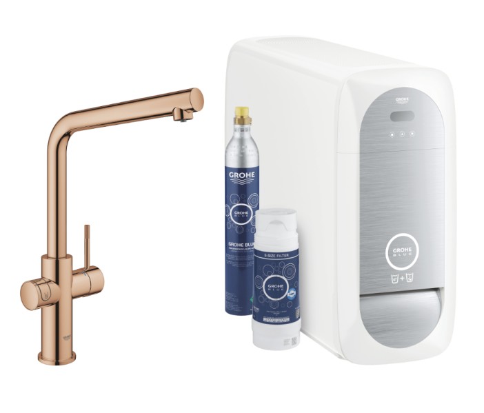 Je zal nooit meer flessen water kopen als je het gemak hebt ervaren om thuis een filtersysteem te hebben, waarmee je met een druk op de knop kunt genieten van puur, plat of bruisend water direct uit de kraan. De GROHE Blue Home Duo starterkit is de complete manier om te genieten van puur, gekoeld drinkwater. Kies uit plat, medium of bruisend water. Met behulp van de GROHE Ondus-app** kan je nu je kraan activeren met je smartphone ***. Je kunt ook je verbruik controleren en zelfs instellen om filters en CO2-flessen opnieuw te bestellen wanneer deze aan vervanging toe zijn. Je kunt verder je telefoon gebruiken om je kraan op afstand in te stellen en je kunt jouw watergebruiksstatistieken koppelen aan je fit-apps. De set bevat een GROHE Blue- keukenkraan met één hendel in stijlvol Warm Sunset en een energiezuinige thuiskoeler met daarin de filter en de CO2-fles voor carbonisatie. De koeler past in ieder keukenkastje dat meer dan 30 cm breed is, waardoor deze zelfs voor compacte keukens ideaal is. Zowel het filter als de CO2-fles van 425 gram verwijderen en vervangen is een fluitje van een cent. Je Blue Home Duo- kraan bevat alle voordelen van een geweldig design en klassieke looks, die kenmerkend zijn voor alle GROHE keukenkranen. De eenvoudig te gebruiken hoge C-uitloop met 150° draaibeweging en slanke lichaam bevat gescheiden binnenwaterwegen voor gefilterd en niet-gefilterd water. Als je de hendel aanraakt, krijg je standaard water om af te wassen. Maar druk je op de verlichte LED- drukknop dan activeer je de filter voor gekoeld of bruisend water uit de kraan. Het LED-display geeft aan wanneer de cartridge moet worden vervangen. Deze monobloc keuken mengkraan is vervaardigd in GROHE's karakteristieke vloeiende lijnen en bevat een krasbestendige GROHE StarLight afwerking en is voorzien van het duurzame GROHE SilkMove interne mechanisme voor een soepele bediening. En omdat er geen externe leidingen nodig zijn en alles in de set klaar is voor gebruik, duurt het maximaal 30 minuten om te installeren. GROHE Blue Home – de slimme nieuwe manier om te genieten van zuiver gefilterd water direct uit je kraan. * Met Bluetooth® 4.0 en WIFI-interface voor draadloze datacommunicatie (het Bluetooth®-woordmerk en -logo's zijn gedeponeerde handelsmerken van Bluetooth SIG, Inc. en elk gebruik van deze merken door Grohe AG gebeurt onder licentie. Andere handelsmerken en handelsnamen zijn die van hun respectieve eigenaars.) ** Gratis beschikbaar via iTunes-app of Google Play Store. *** Systeemvereisten: Apple iPhone met iOS 9.0 of hoger; Android-smartphone met Android 4.3 of hoger (Apple, het Apple-logo, iPod, iPod Touch, iPhone en iTunes zijn handelsmerken van Apple Inc., geregistreerd in de VS en andere landen.) Apple is niet verantwoordelijk voor de werking van dit apparaat of de naleving ervan op het gebied van veiligheid en wettelijke voorschriften).