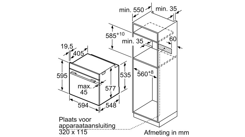Inbouwafmetingen (HxBxD): 585-595 x 560-568 x 550 mm