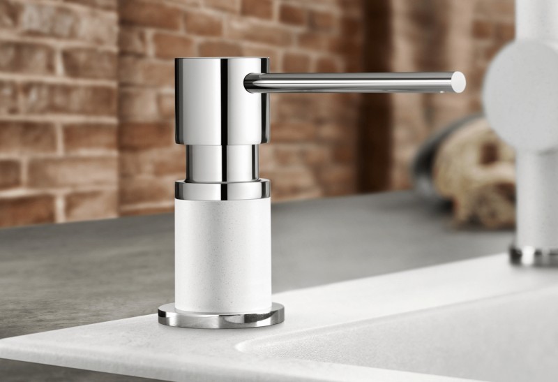 Afwasmiddeldispenser in een tijdloos modern designMetaaloppervlak en tweekleurige designs passen perfect bij BLANCO