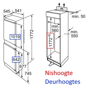 De kast waarin uw koelvriescombinatie geplaatst zal worden heeft normaal gezien een standaard breedte en diepte. De hoogte van uw koelvriescombinatie kan wel verschillen afhankelijk van de kast. Het is daarom van groot belang dat u de nishoogte (breedte en diepte mag ook) van uw kast goed meet. De gemeten nishoogte (hoogte van de open ruimte binnen in de kast) controleert u daarna met de aanbevolen inbouwafmetingen van de fabrikant om te weten of het toestel in uw kast zal passen. Bij een koelvriescombinatie is het ook van belang dat de hoogte van uw deurpanelen overeen komen met de aanbevolen afmetingen van de fabrikant. *U kan de inbouwafmetingen van een toestel terugvinden bij de specificaties van het toestel als ook op de technische tekening bij de afbeeldingen.