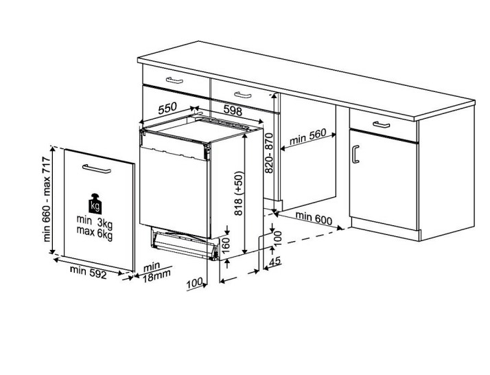 Afmetingen nis (H x B x D) : 820-870 x 598 x 555 mm
